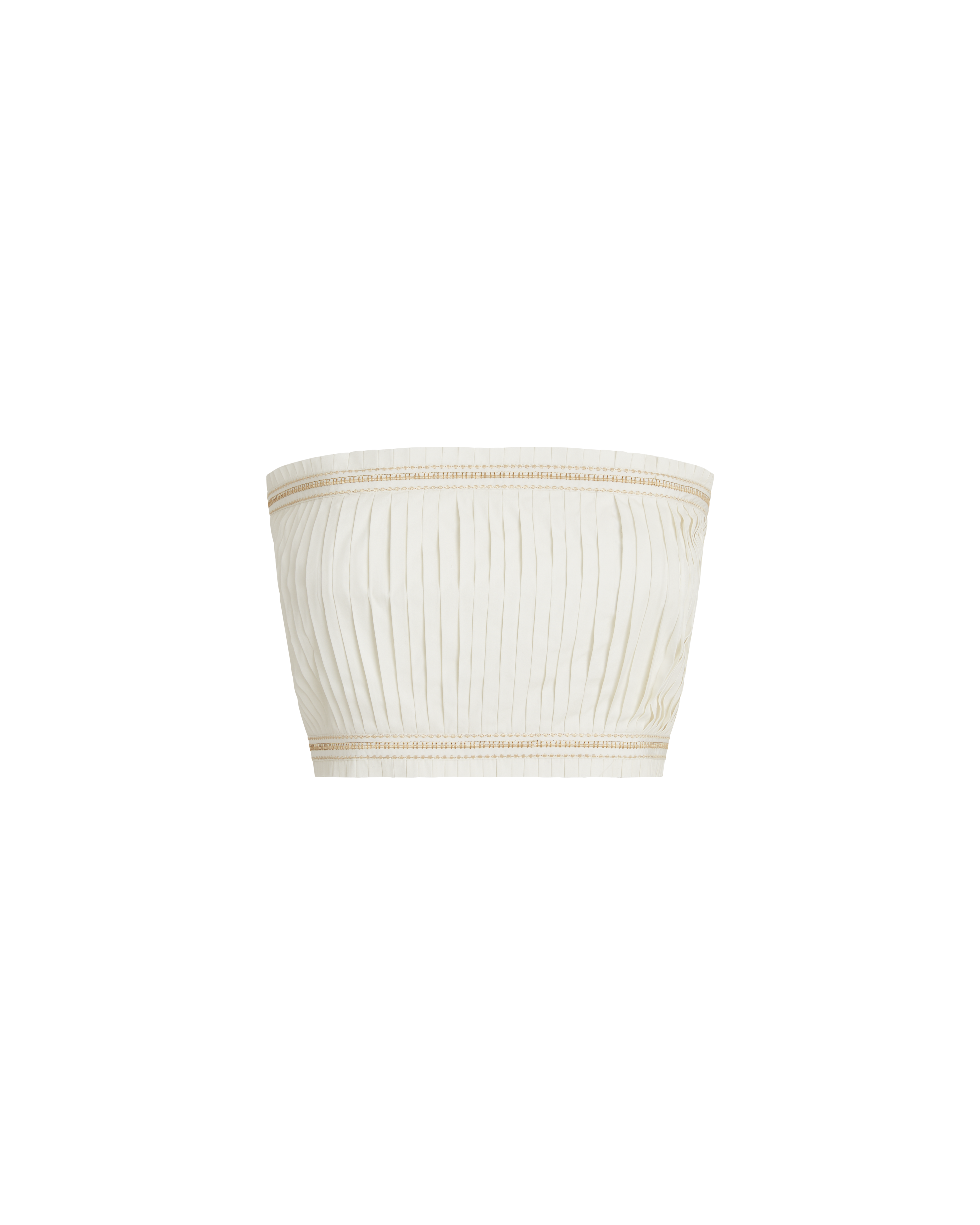 Updating classic corsetry with elasticized paneling, this double-layer bandeau top is as supportive as it is gorgeous. Flaunting hypnotic pleats and embroidered trims inspired by the intricate white-and-gold inlays and mosaics of Arabic architecture, it makes a stunning pairing with the matching Camille Skirt and can be layered under or over casual ensembles to create playful summer looks.
