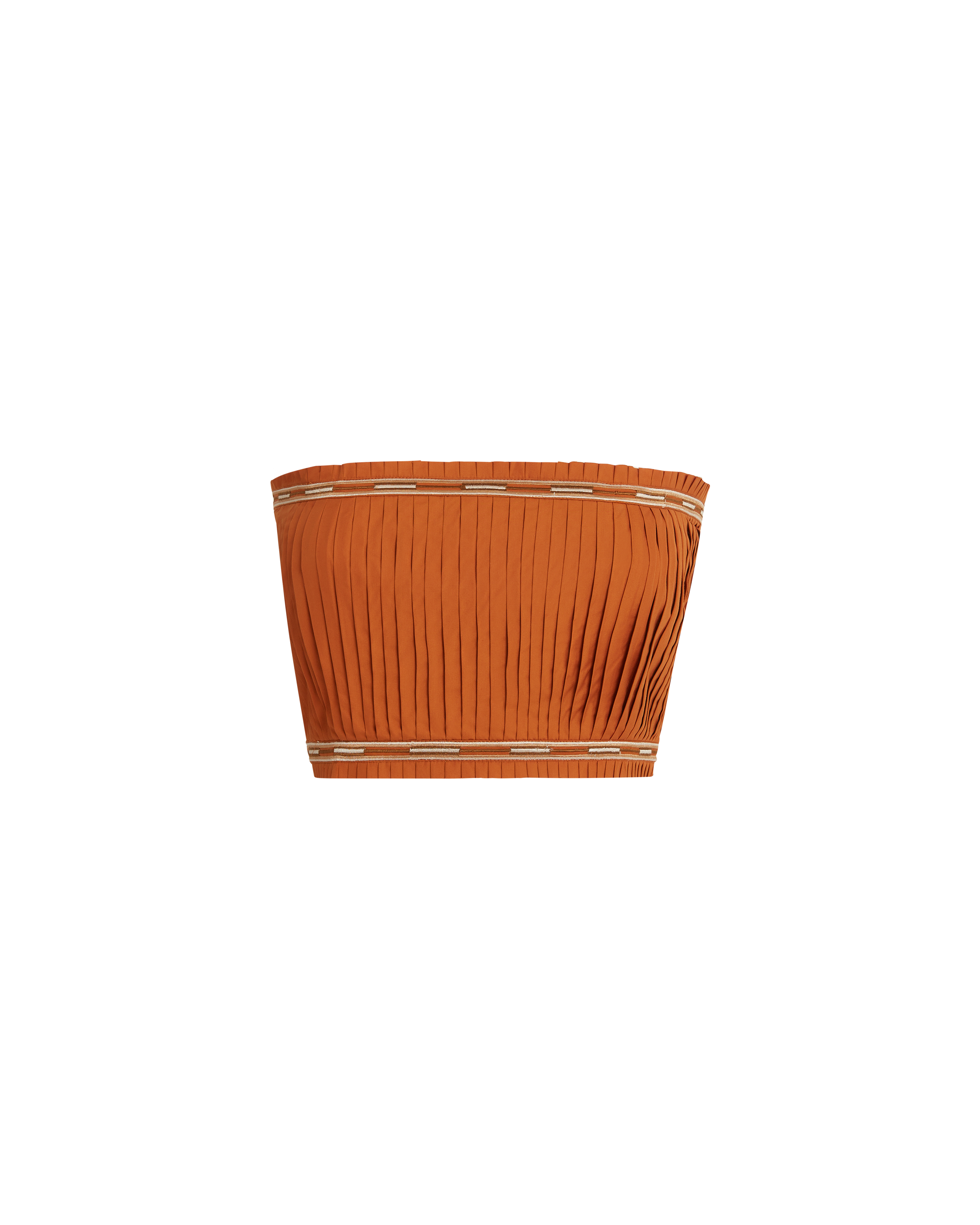 A perfect complement to our Backgammon assortment yet a statement piece in its own right, the Flavia Top features mesmerizing pleats and exquisite embroidered detailing. Drawing inspiration from classic corsetry, this bandeau pairs beautifully with the coordinating Ombretta Skirt. Available in a warm Cinnamon shade.