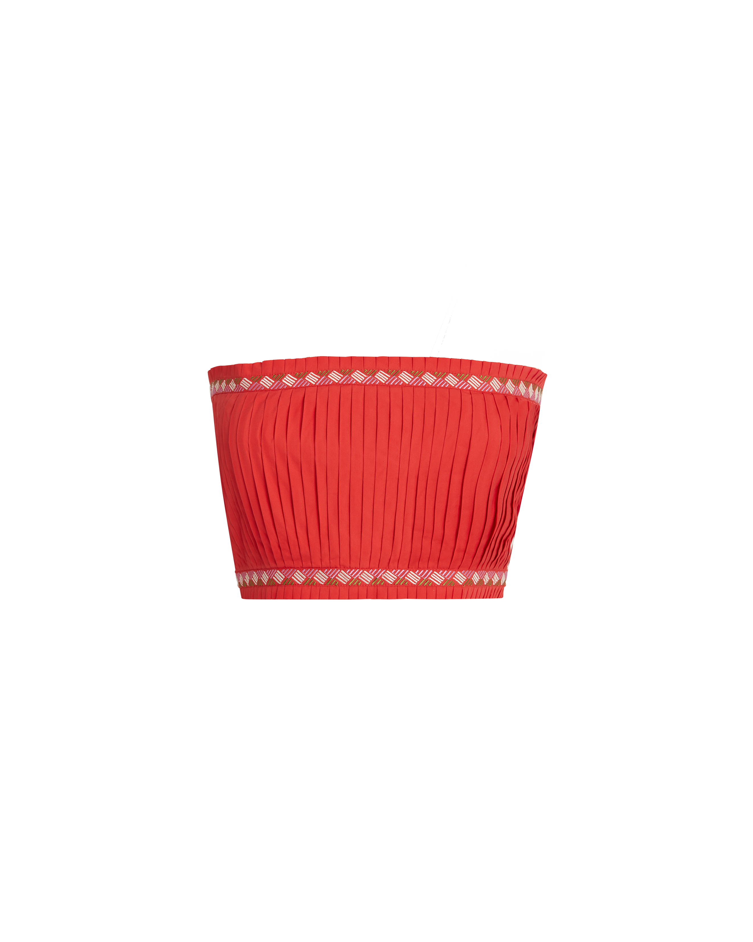 Perhaps our most recognized top, the Flavia is a pleated bandeau style that showcases mesmerizing pleats and exquisite detailing, perfectly complementing the Japanese Peacock embroidery featured in our Spring/Summer collection. To achieve the signature Emporio Sirenuse look, pair this vibrant red corset with the matching Tasha Skirt.